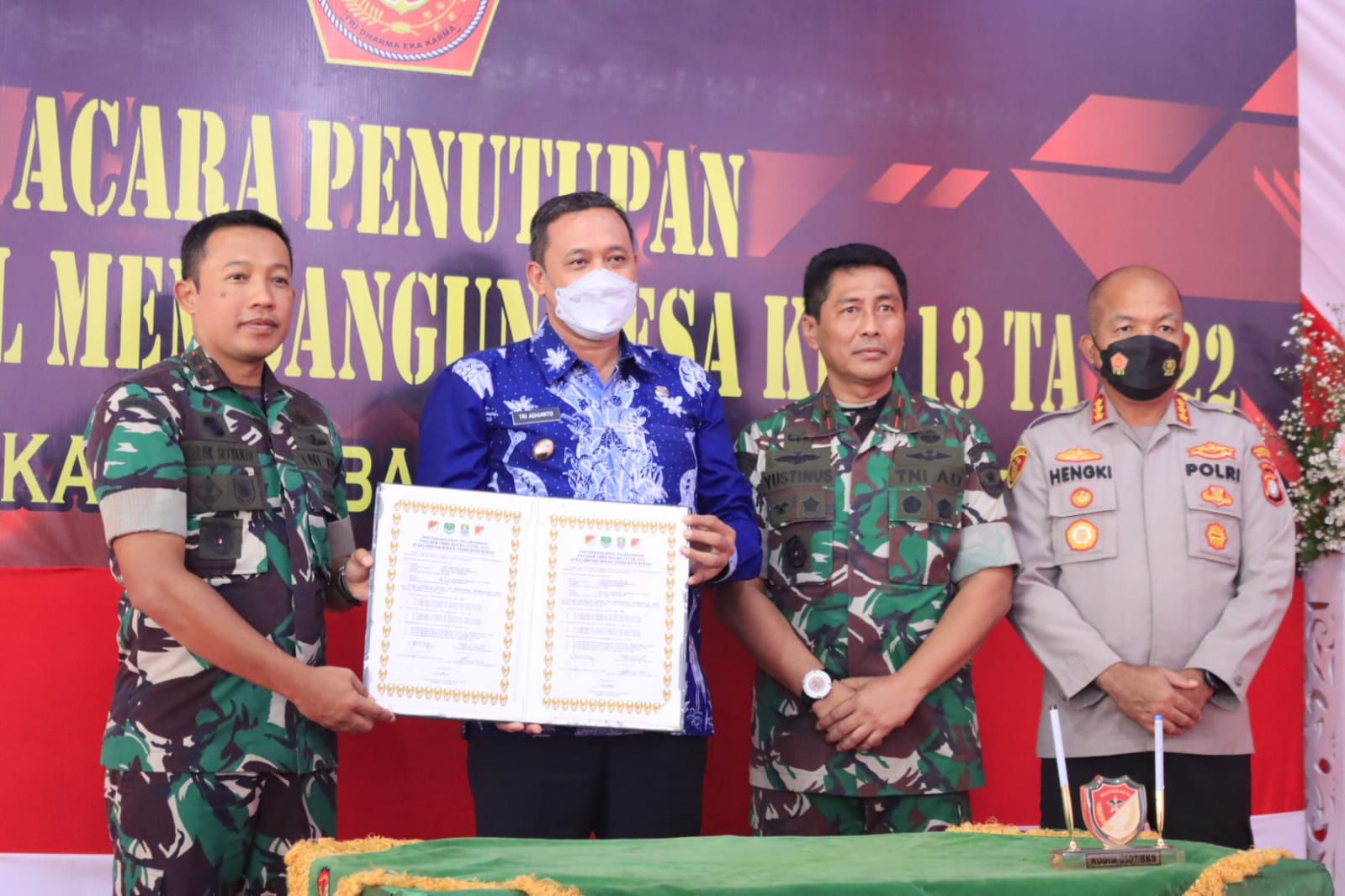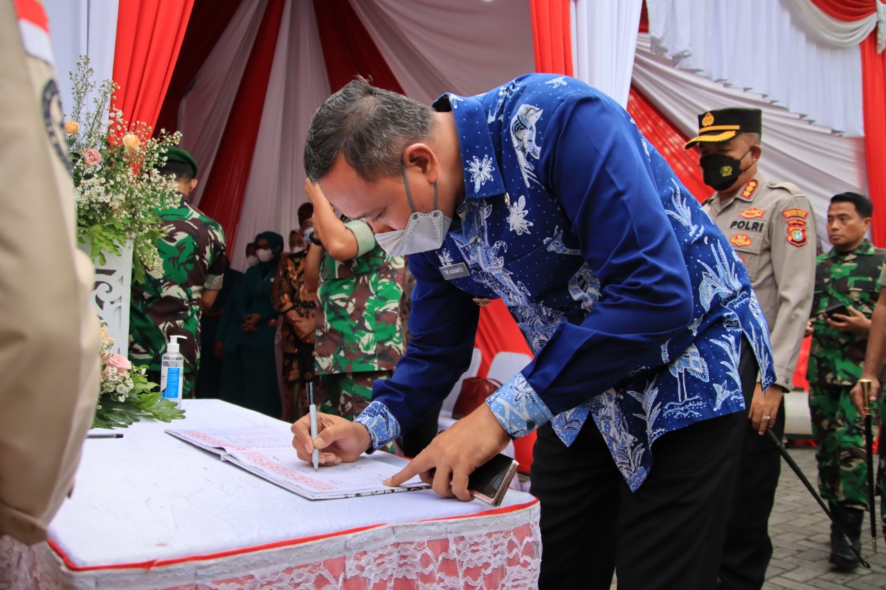 IMN News, Kota Bekasi – Pelaksana Tugas (Plt) Wali Kota Bekasi Tri Adhianto bersama Dandim 0507/Bekasi Letkol Kav. Luluk Setyanto dan Kapolres Metro Bekasi Kota Kombespol Hengky sambut Danrem 051/Wkt Brigjen TNI Yustinus Nono Yulianto diacara penutupan penandatanganan penyerahan naskah program TNI Manunggal Membangun Desa (TMMD) yang dilaksanakan di Kelurahan Teluk Pucung Kecamatan Bekasi Utara, Kamis (09/06).
