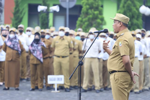 KOTA BEKASI – Pelaksana Tugas (Plt) Wali Kota Bekasi Tri Adhianto pimpin apel gabungan ASN Eselon II, III , IV dan Non ASN lingkup Pemerintah Kota Bekasi di Plaza Pemda Kota Bekasi, Senin (13/06).